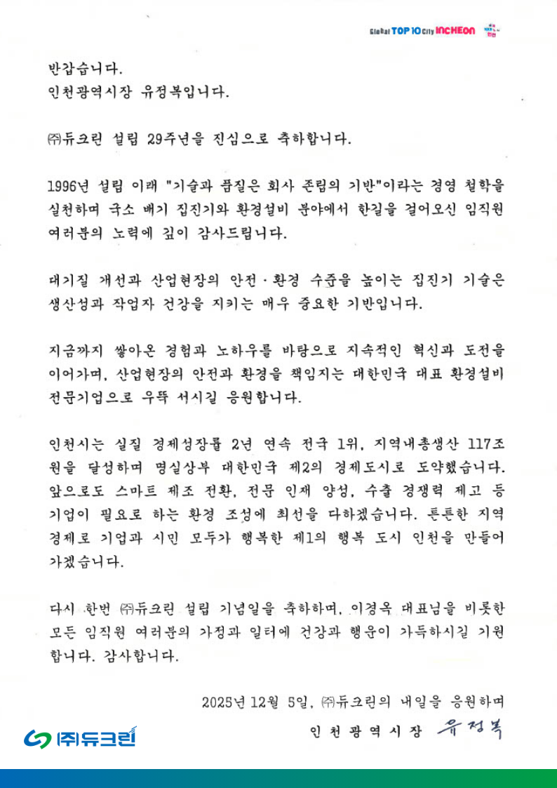 (주)듀크린 창립 29주년, 인천시장 축사